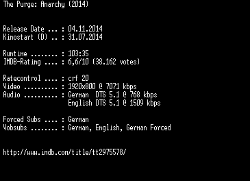 | FiLENAME: | The.Purge.Anarchy.German.DL.1080p.BluRay.x264-EXQUiSiTE.mkv |