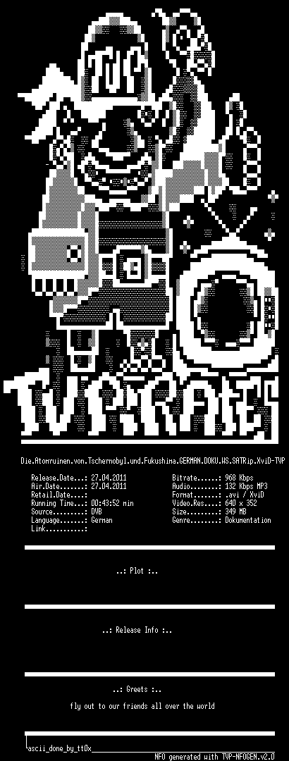 | FiLENAME: | Die.Atomruinen.von.Tschernobyl.und.Fukushima.GERMAN.DOKU.WS.SATRip.XviD-TVP.avi |