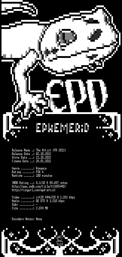 | FiLENAME: | The.Artist.German.720p.BluRay.x264-EPHEMERiD.mkv |