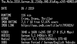 | FiLENAME: | The.Mule.2018.German.DL.2160p.UHD.BluRay.x265-HDMEDiA.mkv |