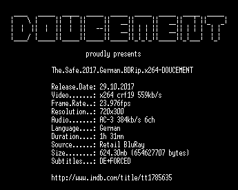| FiLENAME: | The.Safe.2017.German.BDRip.x264-DOUCEMENT.mkv |