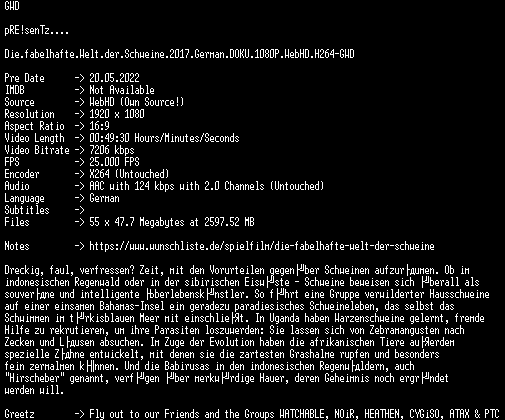 | FiLENAME: | Die.fabelhafte.Welt.der.Schweine.2017.German.DOKU.1080P.WebHD.H264-GWD.mkv |