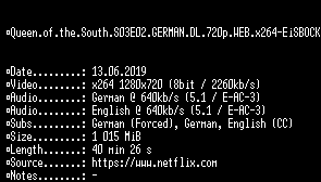 | FiLENAME: | Queen.of.the.South.S03E02.GERMAN.DL.720p.WEB.x264-EiSBOCK.mkv |