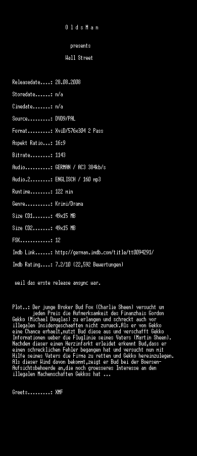 | FiLENAME: | Wall.Street.GERMAN.1987.REPACK.AC3.DVDRiP.XViD.iNTERNAL-OldsMan.CD2.avi |