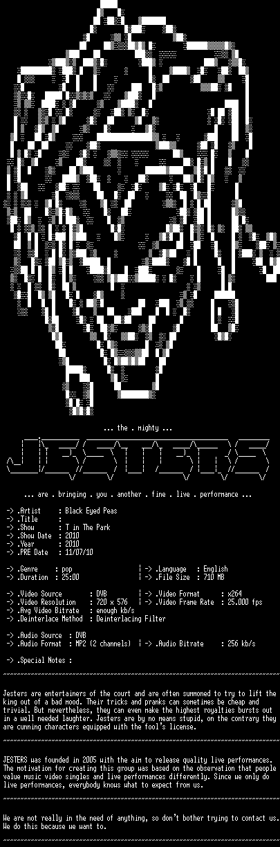 | FiLENAME: | Black_eyed_peas_(live_t_in_the_park_2010)-x264-2010-JESTERS.rar |