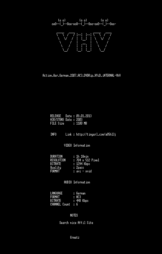 | FiLENAME: | Action.War.German.2007.AC3.DVDRip.XViD.iNTERNAL-VhV.avi |