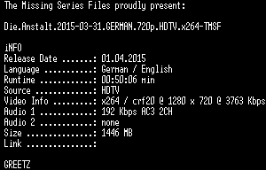 | FiLENAME: | Die.Anstalt.2015-03-31.GERMAN.720p.HDTV.x264-TMSF.mkv |
