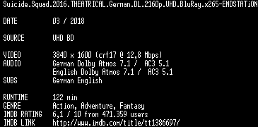 | FiLENAME: | Suicide.Squad.2016.THEATRICAL.German.DL.2160p.UHD.BluRay.x265-ENDSTATiON.mkv |
