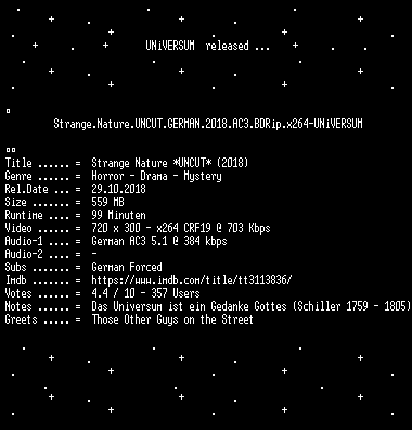 | FiLENAME: | Strange.Nature.UNCUT.GERMAN.2018.AC3.BDRip.x264-UNiVERSUM.mkv |