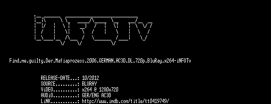 | FiLENAME: | Find.me.guilty.Der.Mafiaprozess.2006.GERMAN.AC3D.DL.720p.BluRay.x264-iNFOTv.mkv |