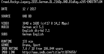 | FiLENAME: | Creed.Rockys.Legacy.2015.German.DL.2160p.UHD.BluRay.x265-ENDSTATiON.mkv |