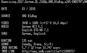 | FiLENAME: | Downsizing.2017.German.DL.2160p.UHD.BluRay.x265-ENDSTATiON.mkv |