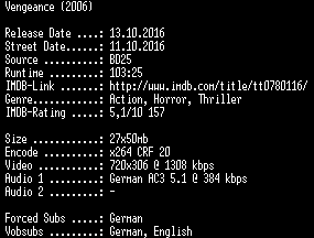 | FiLENAME: | Vengeance.German.2006.AC3.BDRip.x264-SPiCY.mkv |
