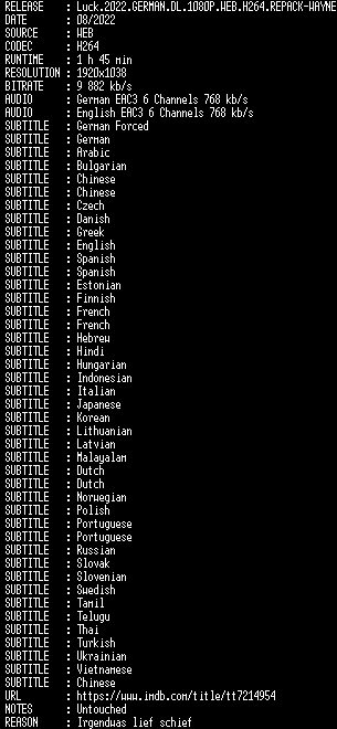 | FiLENAME: | Luck.2022.GERMAN.DL.1080P.WEB.H264.REPACK-WAYNE.mkv |