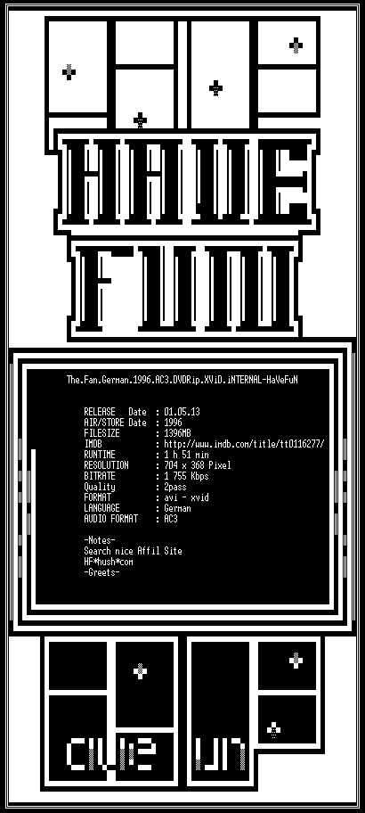 | FiLENAME: | The.Fan.German.1996.AC3.DVDRip.XViD.iNTERNAL-HaVeFuN.avi |