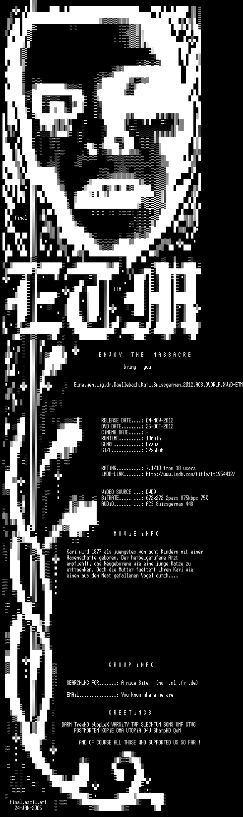 | FiLENAME: | Eine.wen.iig.dr.Daellebach.Kari.Swissgerman.2012.AC3.DVDRiP.XViD-ETM.avi |