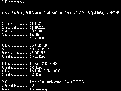 | FiLENAME: | Die.SciFi.Story.S01E03.Angriff.der.Aliens.German.DL.DOKU.720p.BluRay.x264-TV4A.mkv |