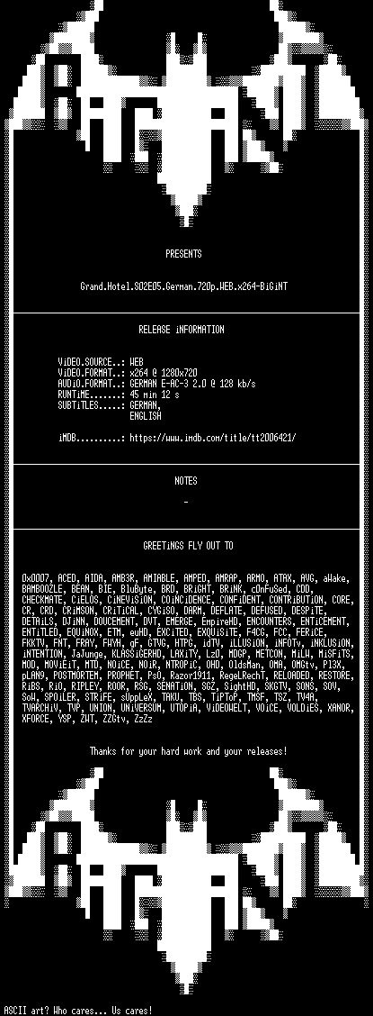 | FiLENAME: | Grand.Hotel.S02E05.German.720p.WEB.x264-BiGiNT.mkv |