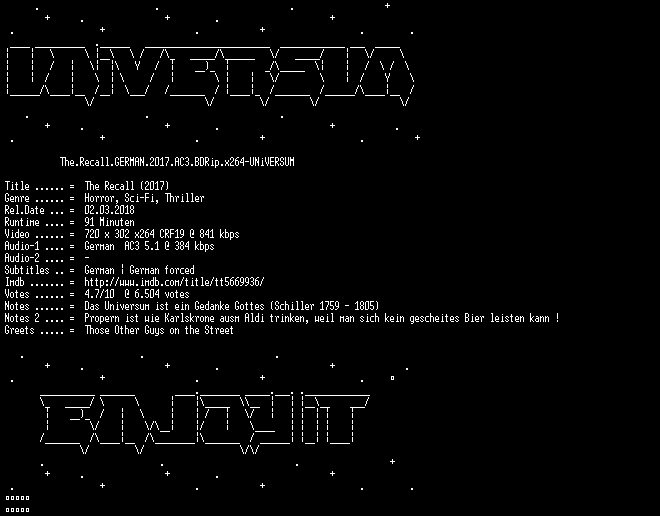 | FiLENAME: | The.Recall.GERMAN.2017.AC3.BDRip.x264-UNiVERSUM.mkv |