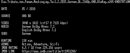 | FiLENAME: | Die.Tribute.von.Panem.Mockingjay.Teil.2.2015.German.DL.2160p.UHD.BluRay.x265-ENDSTATiON.mkv |