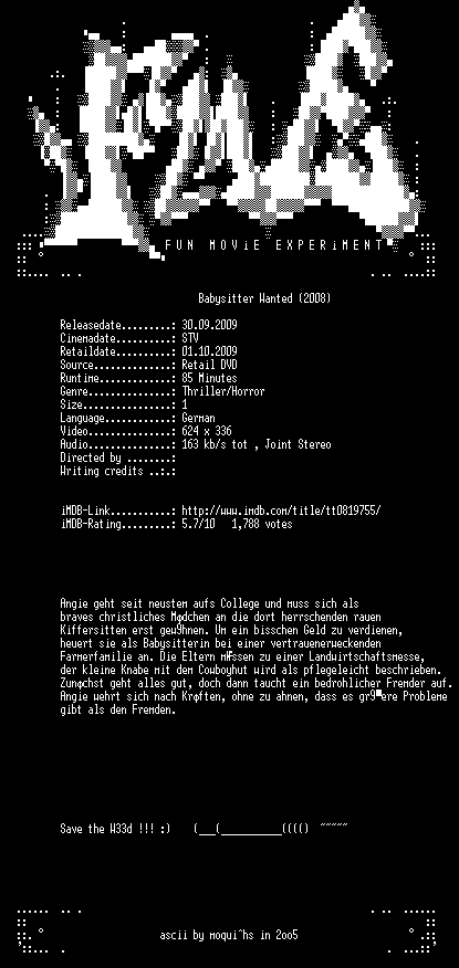 | FiLENAME: | Babysitter.Wanted.German.2008.DVDRip.Xvid-FmE.avi |