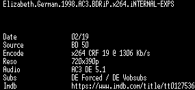 | FiLENAME: | Elizabeth.German.1998.AC3.BDRiP.x264.iNTERNAL-EXPS.mkv |