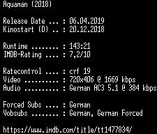 | FiLENAME: | Aquaman.German.2018.AC3.BDRip.x264-COiNCiDENCE.mkv |