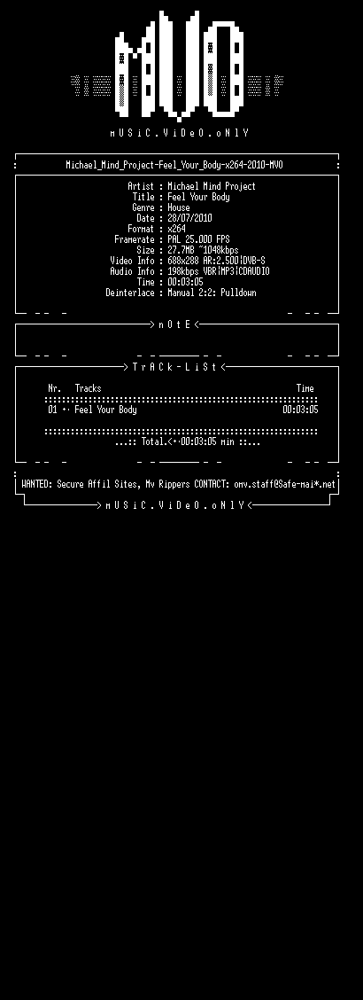| FiLENAME: | Michael_Mind_Project-Feel_Your_Body-x264-2010-MVO.mkv |