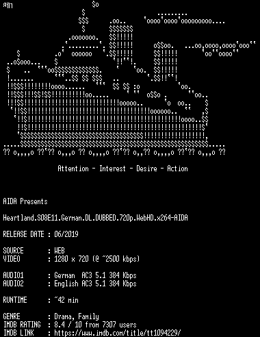 | FiLENAME: | Heartland.S08E11.German.DL.DUBBED.720p.WebHD.x264-AIDA.mkv |