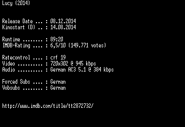 | FiLENAME: | Lucy.German.BDRiP.x264-EXQUiSiTE.mkv |