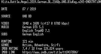 | FiLENAME: | Alita.Battle.Angel.2019.German.DL.2160p.UHD.BluRay.x265-ENDSTATiON.mkv |