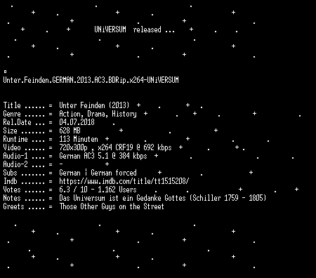 | FiLENAME: | Unter.Feinden.GERMAN.2013.AC3.BDRip.x264-UNiVERSUM.mkv |