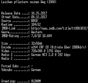 | FiLENAME: | Leichen.pflastern.seinen.Weg.German.REMASTERED.1968.AC3.BDRip.x264-SPiCY.mkv |