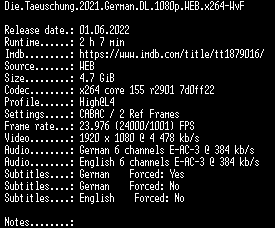 | FiLENAME: | Die.Taeuschung.2021.German.DL.1080p.WEB.x264-WvF.mkv |