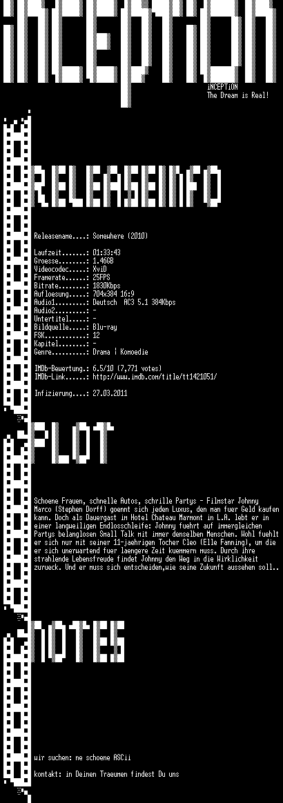 | FiLENAME: | Somewhere.2010.German.AC3.BDRip.XviD-iNCEPTiON.avi |