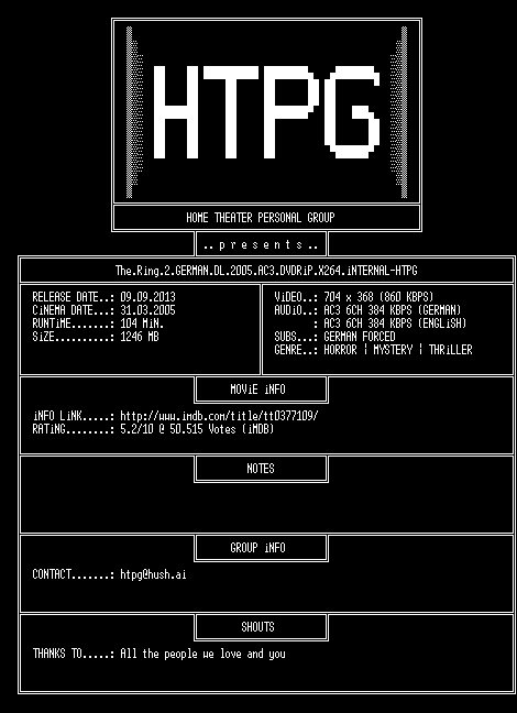 | FiLENAME: | The.Ring.2.GERMAN.DL.2005.AC3.DVDRiP.X264.iNTERNAL-HTPG.mkv |