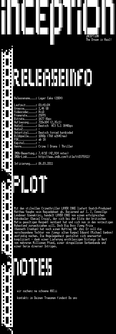 | FiLENAME: | Layer.Cake.2004.German.AC3.HDRip.XviD-iNCEPTiON.avi |
