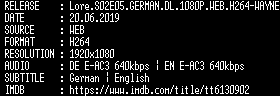 | FiLENAME: | Lore.S02E05.GERMAN.DL.1080P.WEB.H264-WAYNE.mkv |