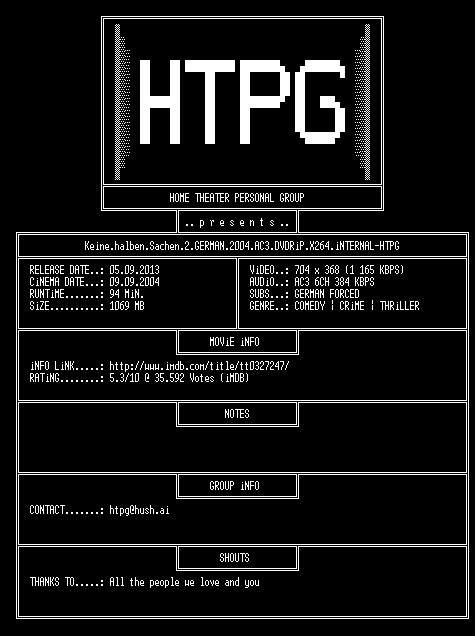 | FiLENAME: | Keine.halben.Sachen.2.GERMAN.2004.AC3.DVDRiP.X264.iNTERNAL-HTPG.mkv |