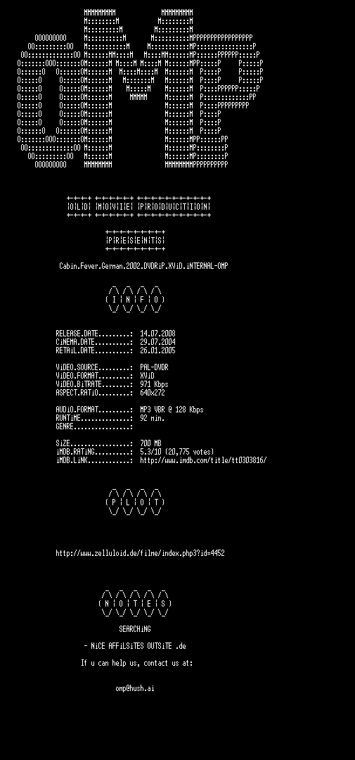 | FiLENAME: | Cabin Fever (2002) [GER WS DVD].avi |