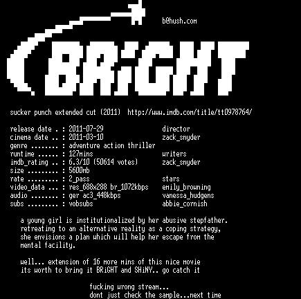 | FiLENAME: | Sucker.Punch.EXTENDED.German.BDRip.AC3.XviD.REPACK-BRiGHT.avi |