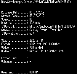 | FiLENAME: | Die.Strohpuppe.German.1964.AC3.BDRiP.x264-SPiCY.mkv |