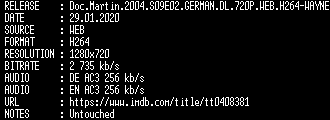 | FiLENAME: | Doc.Martin.2004.S09E02.GERMAN.DL.720P.WEB.H264-WAYNE.mkv |