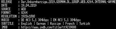 | FiLENAME: | Der.Unbarmherzige.2019.GERMAN.DL.1080P.WEB.X264.INTERNAL-WAYNE.mkv |