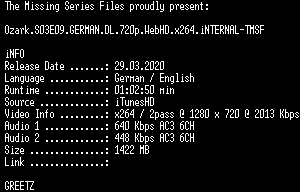 | FiLENAME: | Ozark.S03E09.GERMAN.DL.720p.WebHD.x264.iNTERNAL-TMSF.mkv |