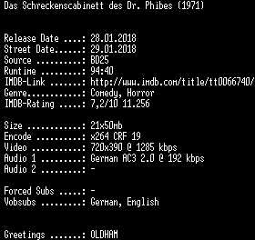 | FiLENAME: | Das.Schreckenscabinett.des.Dr.Phibes.German.REMASTERED.1971.AC3.BDRip.x264-SPiCY.mkv |