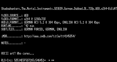 | FiLENAME: | Shadowhunters.The.Mortal.Instruments.S03E09.German.Dubbed.DL.720p.WEB.x264-BiGiNT.mkv |