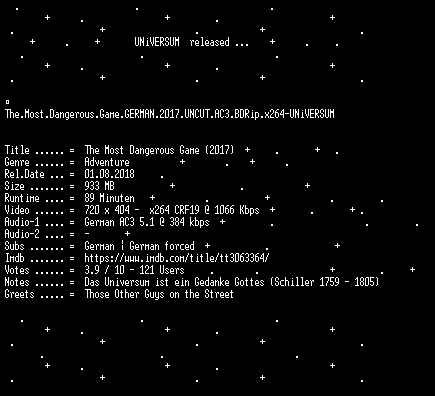 | FiLENAME: | The.Most.Dangerous.Game.GERMAN.2017.UNCUT.AC3.BDRip.x264-UNiVERSUM.mkv |
