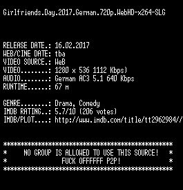 | FiLENAME: | Girlfriends.Day.2017.German.720p.WebHD-x264-SLG.mkv |