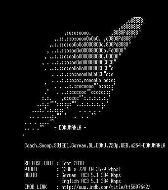 | FiLENAME: | Coach.Snoop.S01E01.German.DL.DOKU.720p.WEB.x264-DOKUMANiA.mkv |
